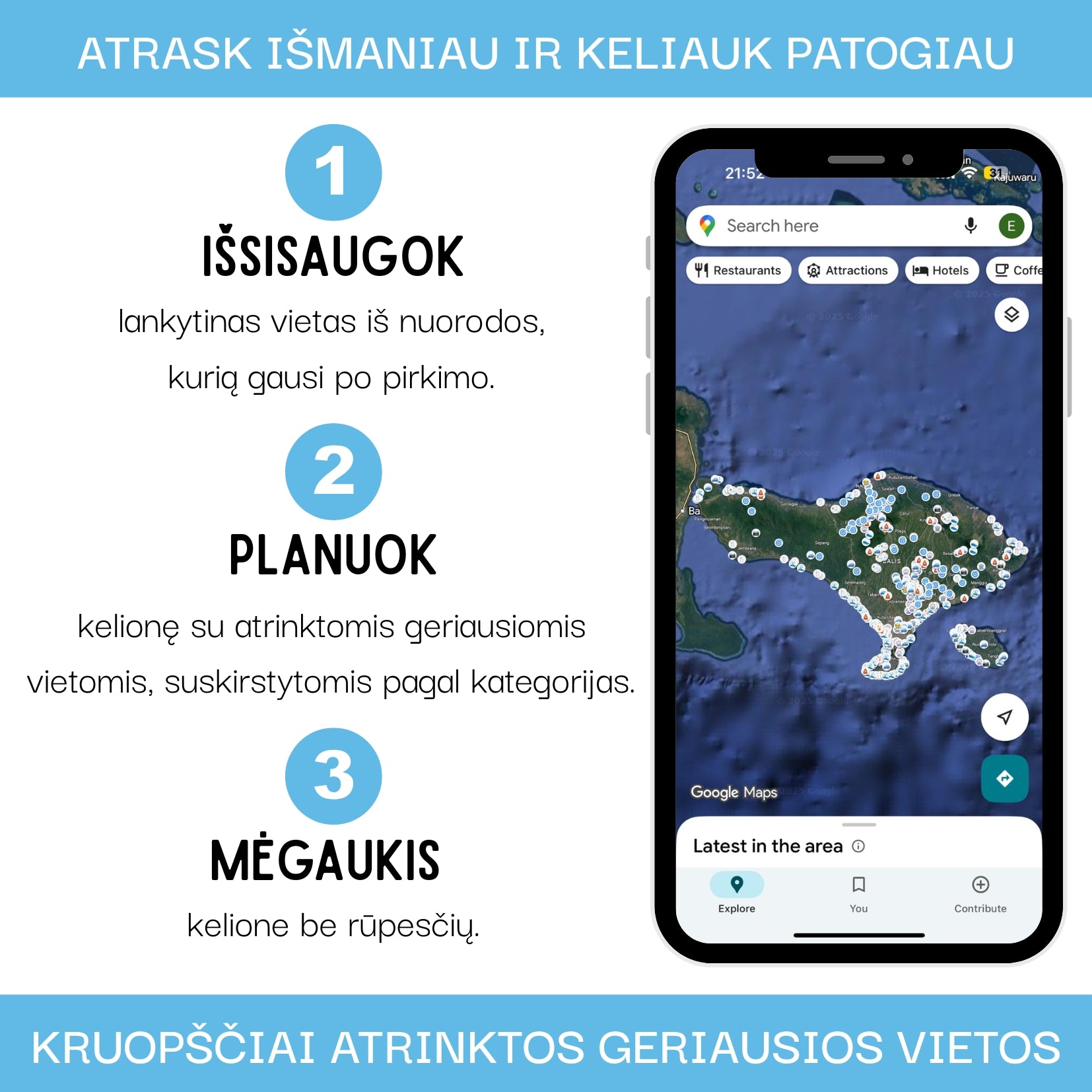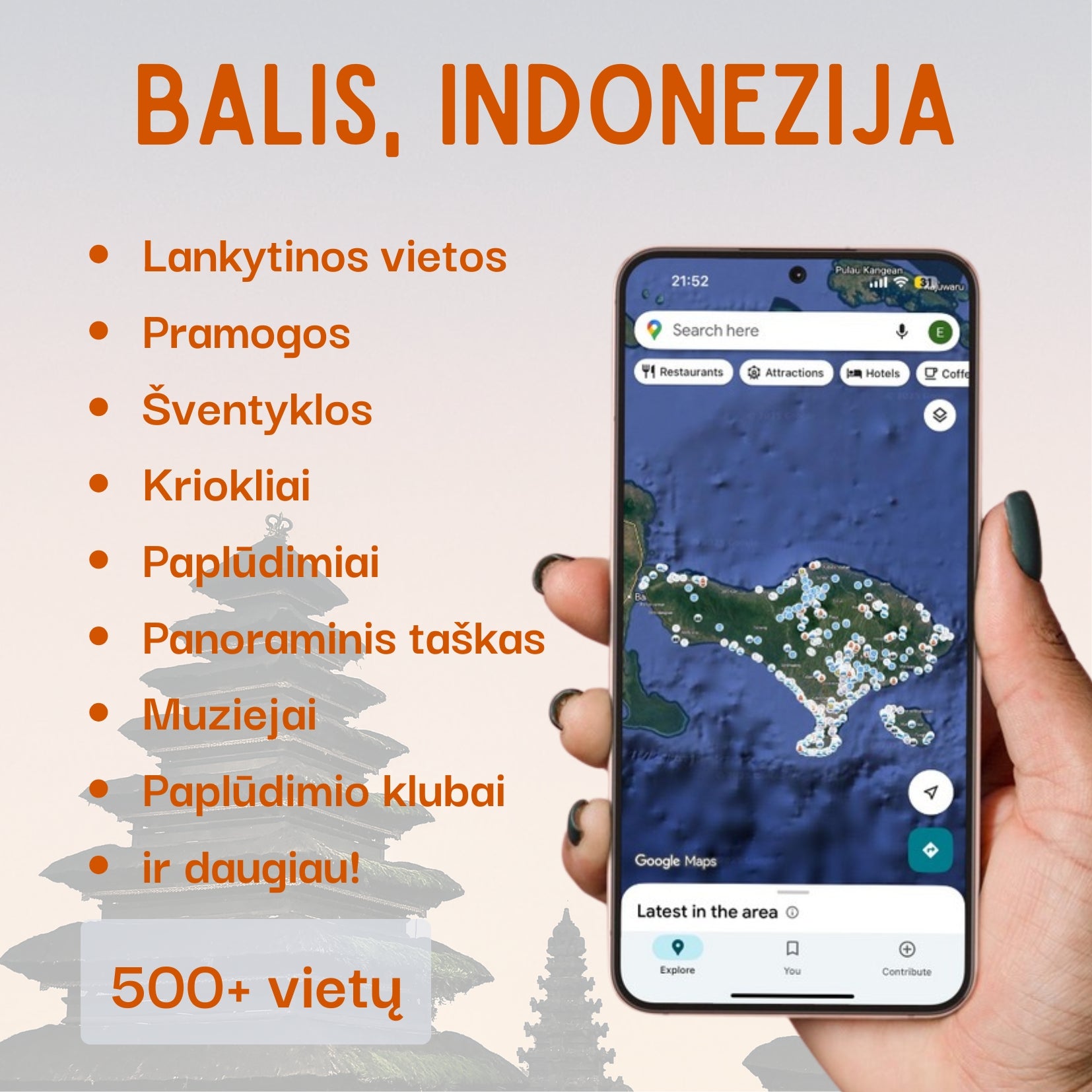 Balis lankytinų vietų žemėlapis – tai išsamus interaktyvus „Google Maps“ gidas su daugiau nei 500 objektų visoje saloje. Šis žemėlapis sukurtas keliautojams, planuojantiems kelionę į Balį ir ieškantiems geriausių vietų poilsiui, nuotykiams ir pažinimui. Šventyklos, kriokliai, paplūdimiai, muziejai, panoraminiai taškai, pramogos ir dar daugiau – viskas vienoje vietoje, jūsų telefone ar kompiuteryje.