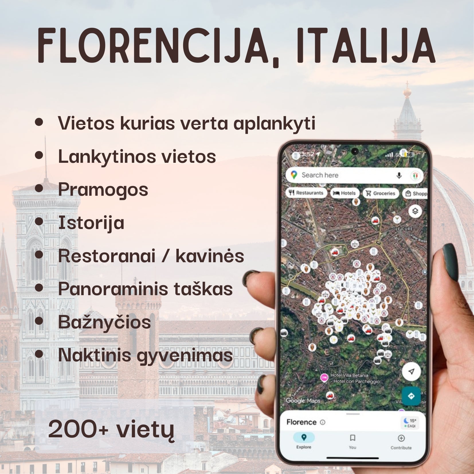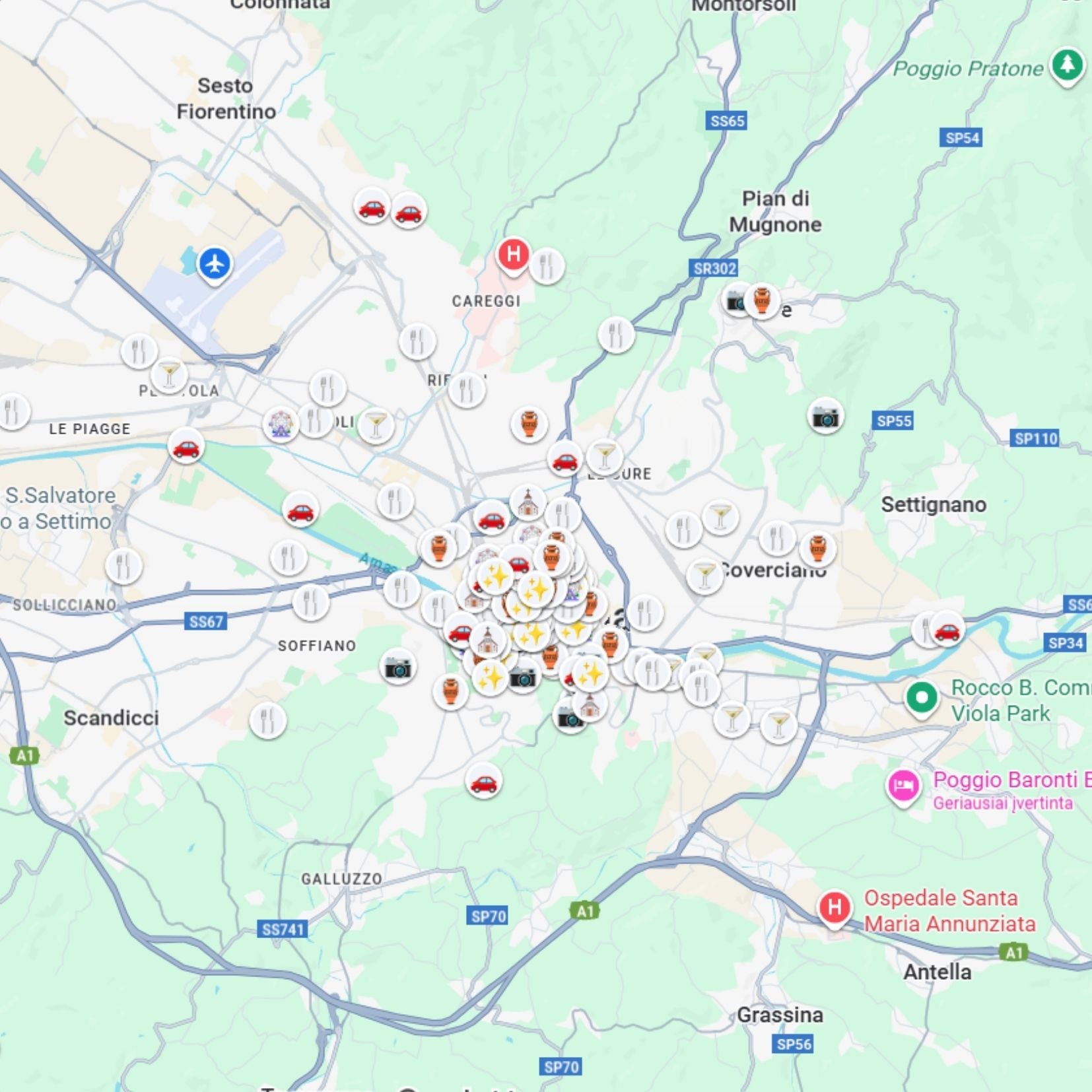 Florencijos lankytinų vietų žemėlapyje – daugiau nei 200 objektų vienoje vietoje. Šis interaktyvus „Google Maps“ gidas sukurtas keliautojams, planuojantiems kelionę į Florenciją ir ieškantiems geriausių vietų Renesanso mieste. Istoriniai paminklai, muziejai, apžvalgos aikštelės, restoranai, kavinės, naktinio gyvenimo vietos ir dar daugiau – viskas viename, lengvai naudojamame žemėlapyje jūsų įrenginyje.