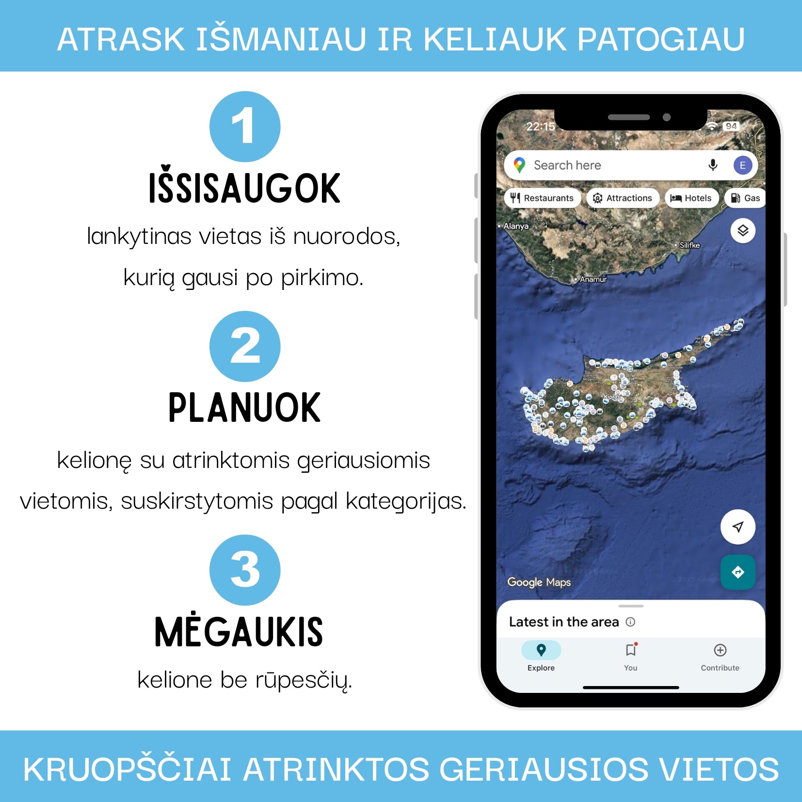 Įsigyk Kipro lankytinų vietų žemėlapį ir atrask daugiau – visi svarbiausi salos objektai tavo telefone!