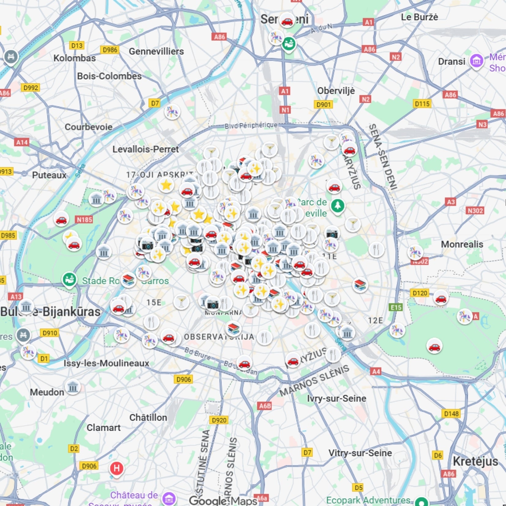 Paryžiaus turistinis žemėlapis – tai interaktyvus „Google Maps“ gidas su daugiau nei 350 lankytinų vietų Prancūzijos sostinėje. Šis išsamus žemėlapis sukurtas keliautojams, planuojantiems kelionę į Paryžių ir norintiems patogiai atrasti įspūdingiausias miesto vietas – muziejus, kavines, istorinius objektus, panoramines aikšteles ir naktinio gyvenimo erdves. Atraskite, ką pamatyti Paryžiuje – viskas vienoje vietoje, patogiai telefone ar kompiuteryje.