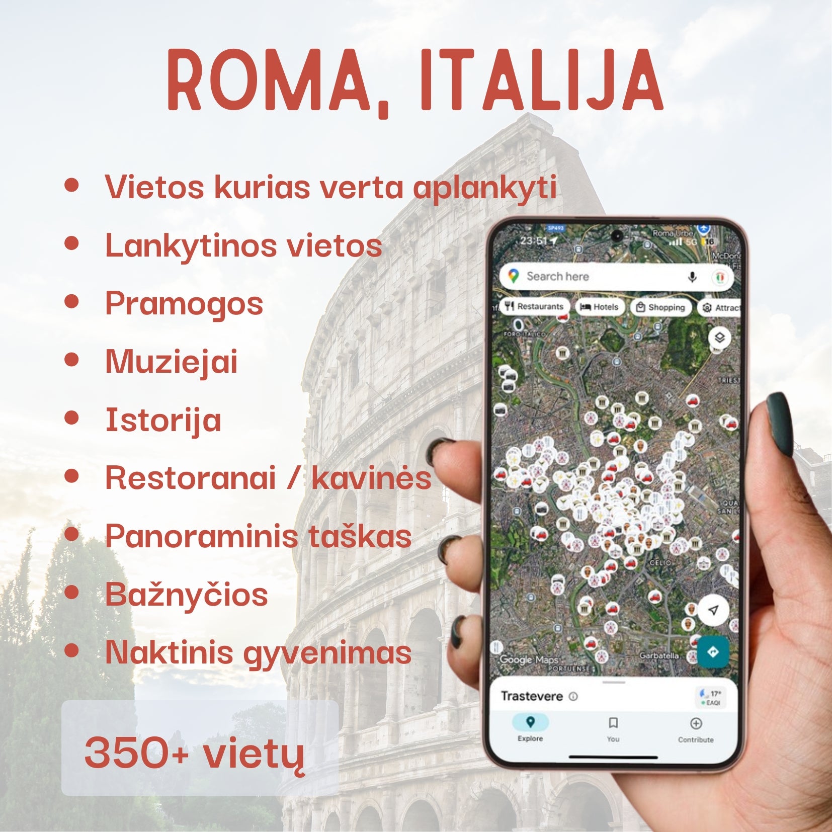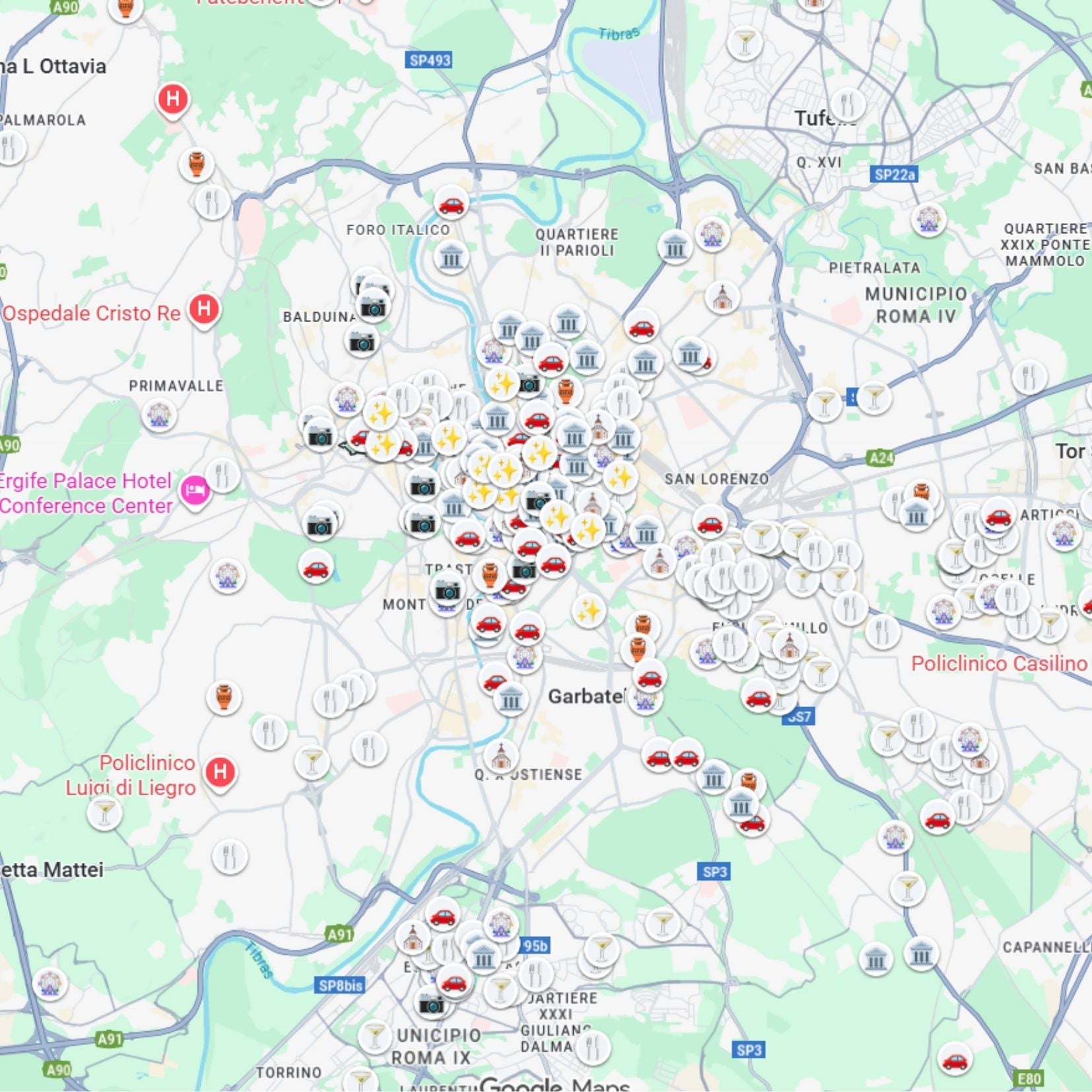 Romos žemėlapyje – daugiau nei 350 vietų vienoje vietoje. Šis interaktyvus „Google Maps“ gidas sukurtas keliautojams, planuojantiems kelionę į Romą ir ieškantiems geriausių lankytinų vietų Amžinajame mieste. Istoriniai objektai, muziejai, apžvalgos aikštelės, restoranai, kavinės, naktinio gyvenimo vietos ir dar daugiau – viskas viename, lengvai naudojamame žemėlapyje jūsų įrenginyje.