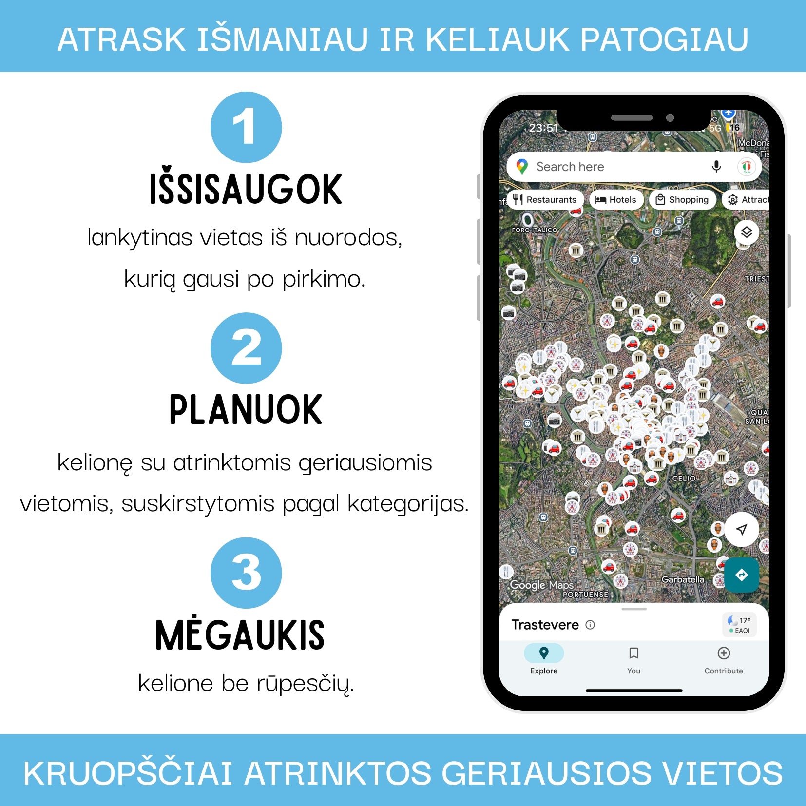 Žemėlapiuose visos lokacijos sugrupuotos pagal kategorijas - lankytnos vietos, pramogos, architektūra, istorija, muziejai, restoranai ir kt.. Taip lengvai susiplanuosite kiekvieną kelionės dieną.